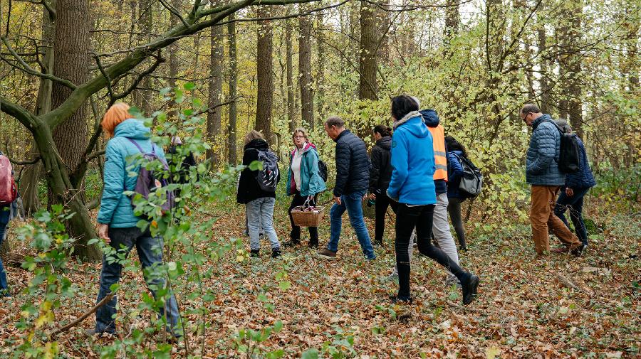 Bei der Exkursion in die Hohe Ward, dem Waldgebiet südlich von Hiltrup, zwischen Hiltrup, Albersloh und Rinkerode gelegen, werden Winter- und Baumpilze gesucht. Die Expert:innen Keuker und Terlutter zeigen die Bestimmungsmerkmale und besprechen ihre Ökologie mit den Exkursionsteilnehmenden.